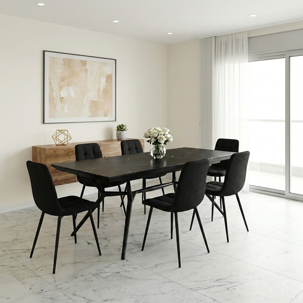 פינת אוכל דגם ורנו דמוי שיש שחור + 6 כסאות – 18 סועדים