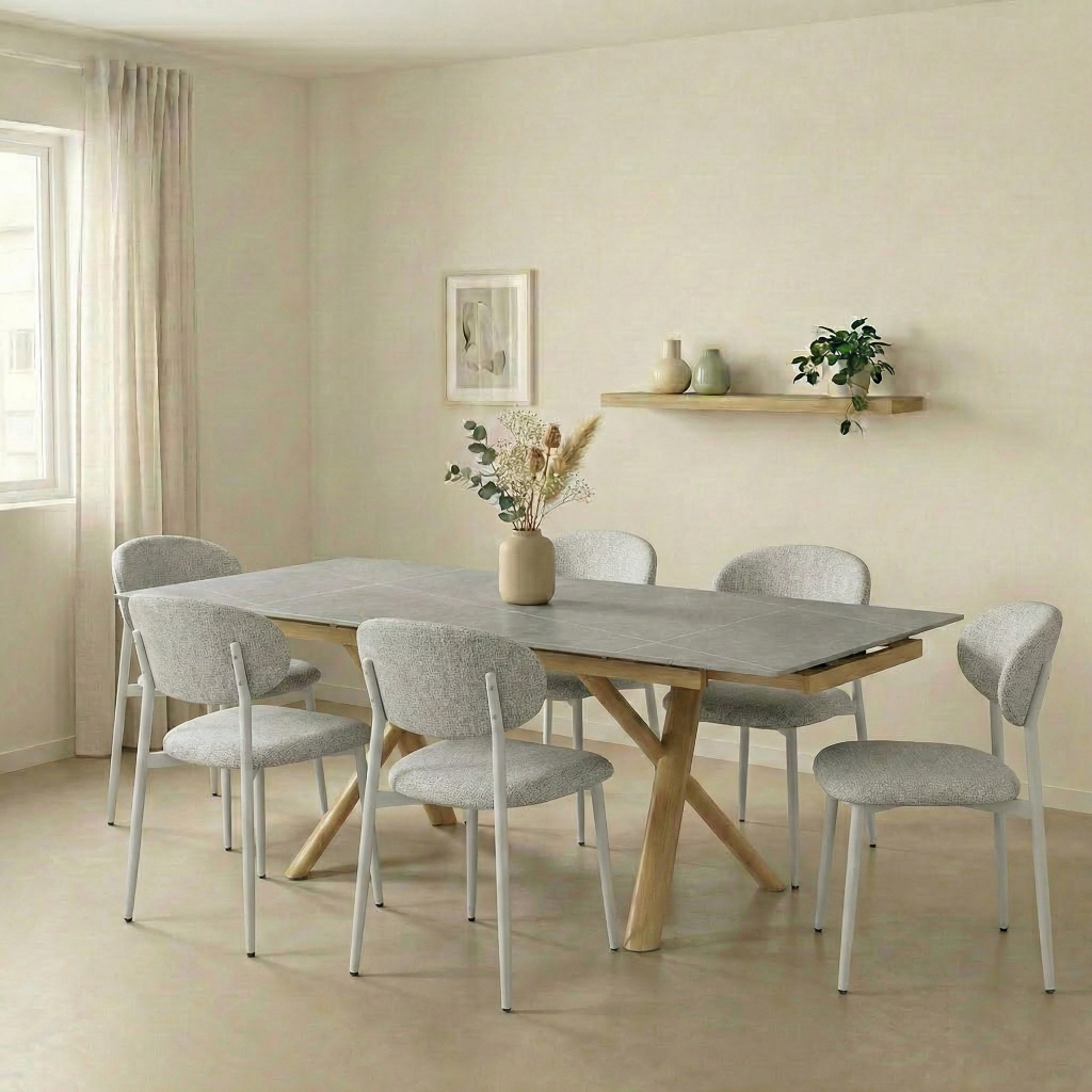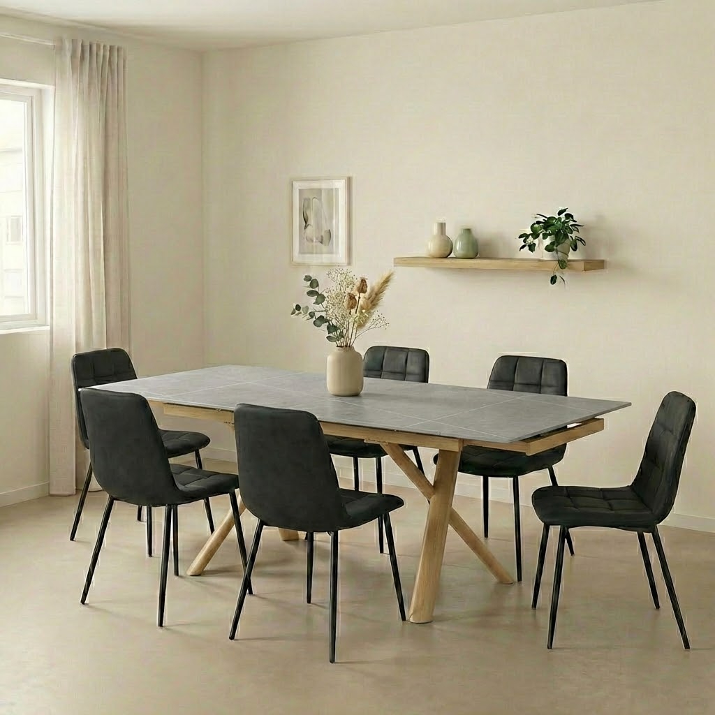 שולחן האוכל ראדו משלב עיצוב מודרני ונוכחות מרשימה עם פתרון אידיאלי לאירוח. פלטת קרמיקה חסינה במיוחד עמידה לחום, שריטות ושחיקה, ומתאימה לשימוש יומיומי אינטנסיבי. השולחן כולל מנגנון פתיחה מהצדדים, נוח וחלק לשימוש, המאפשר להאריך אותו בקלות מאורך 1.60 מ’ ל־2.20 מ’ – מושלם לאירוח משפחתי ולחללים גדולים. רגלי מתכת חזקות בגימור עץ טבעי, עם ציפוי נגד חלודה ו־פלסטיקים למניעת שחיקה והגנה על הרצפה, מעניקות יציבות גבוהה ומראה מודרני, חמים ואלגנטי.