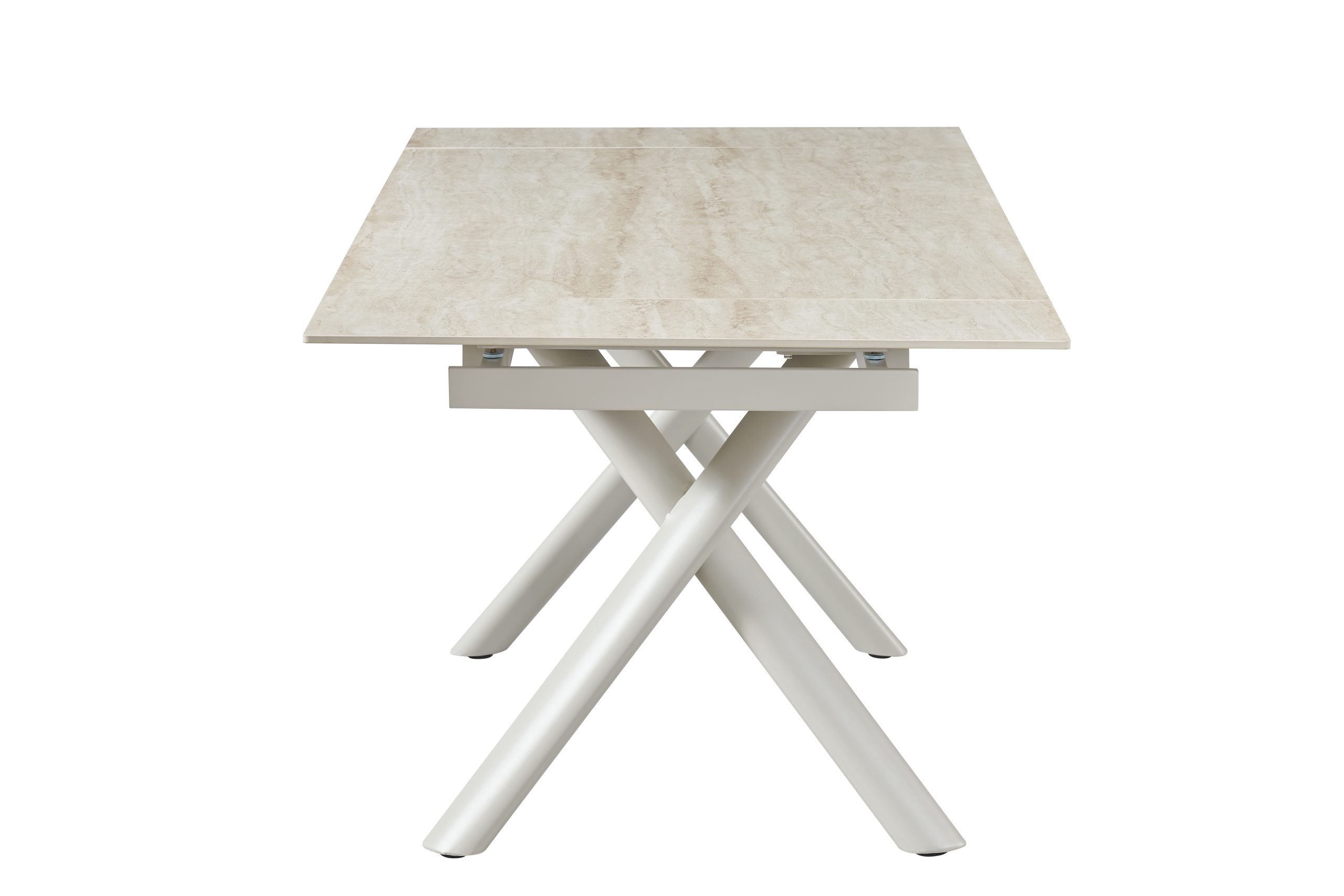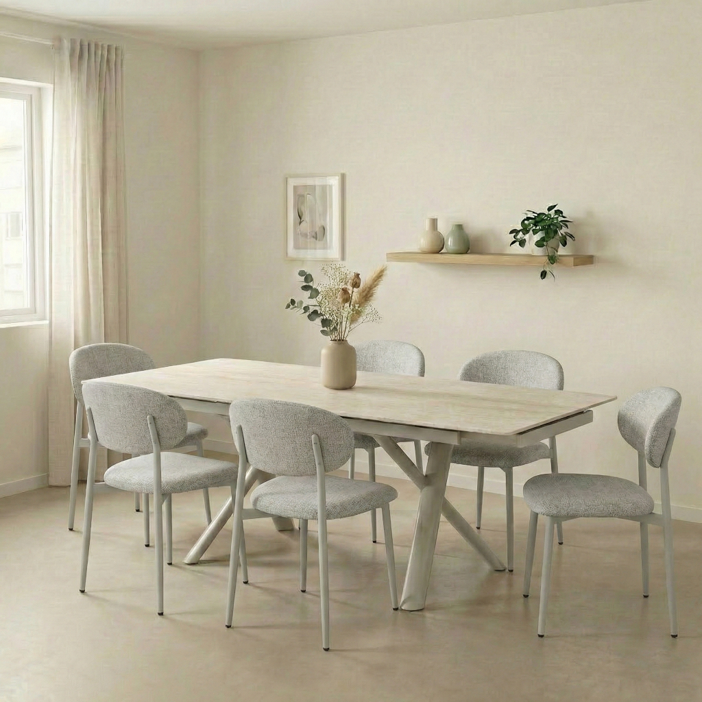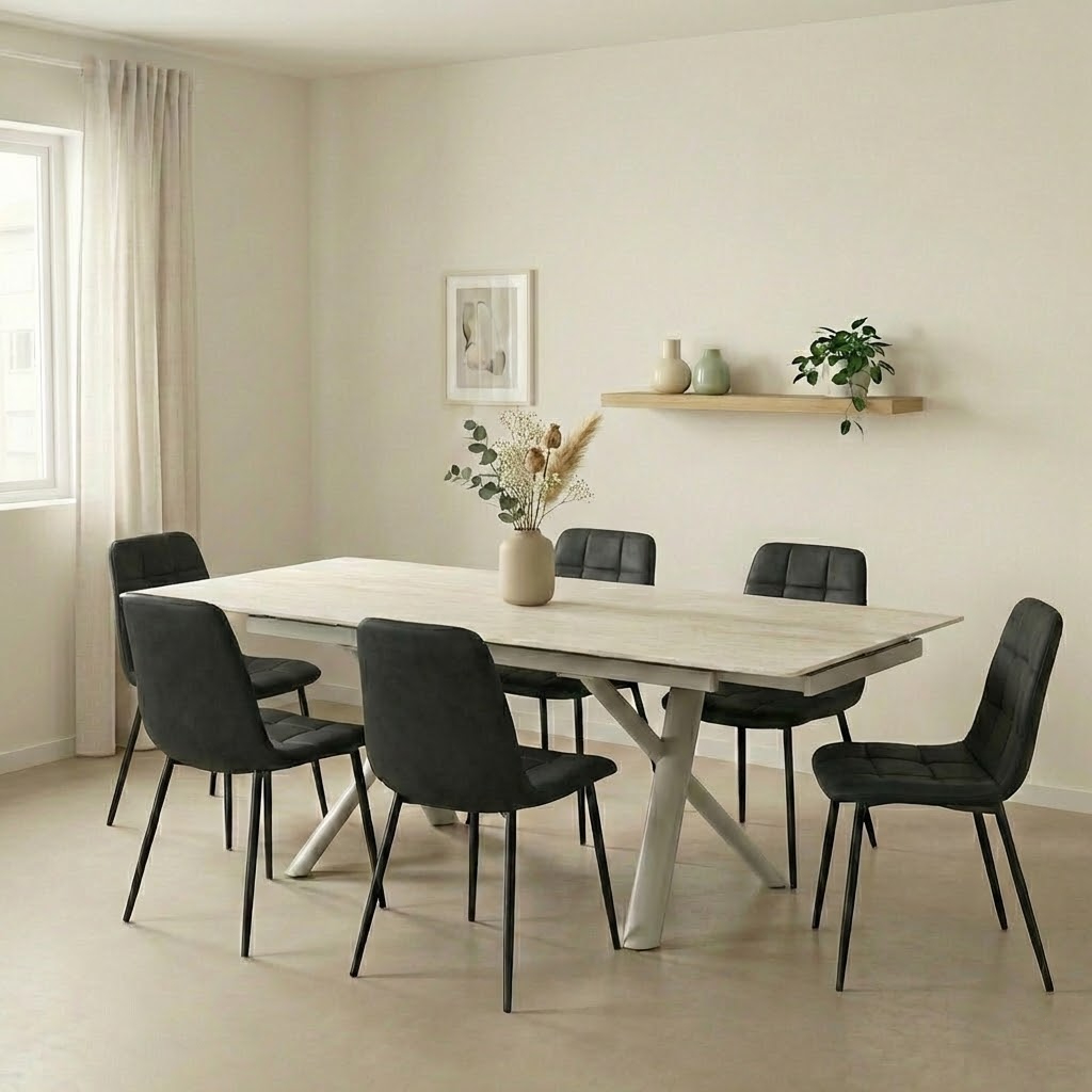 שולחן האוכל ראדו משלב עיצוב מודרני ונוכחות מרשימה עם פתרון אידיאלי לאירוח. פלטת קרמיקה חסינה במיוחד עמידה לחום, שריטות ושחיקה, ומתאימה לשימוש יומיומי אינטנסיבי. השולחן כולל מנגנון פתיחה מהצדדים, נוח וחלק לשימוש, המאפשר להאריך אותו בקלות מאורך 1.60 מ’ ל־2.20 מ’ – מושלם לאירוח משפחתי ולחללים גדולים. רגלי מתכת חזקות בצבע קרם, עם ציפוי נגד חלודה ו־פלסטיקים למניעת שחיקה והגנה על הרצפה, מעניקות יציבות גבוהה ומראה מודרני ואלגנטי.