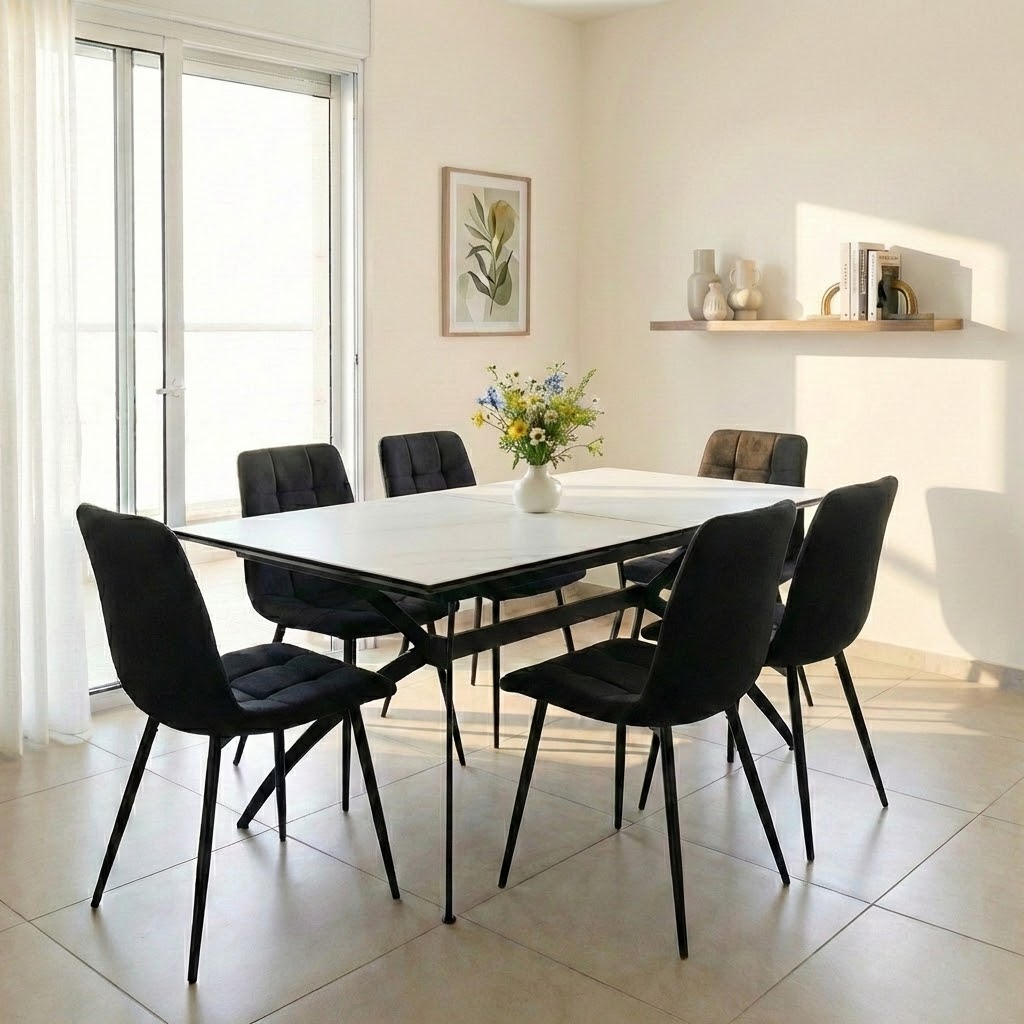 פינת אוכל מלבנית דגם דרמור דמוי שיש לבן + 6 כסאות – 14 סועדים