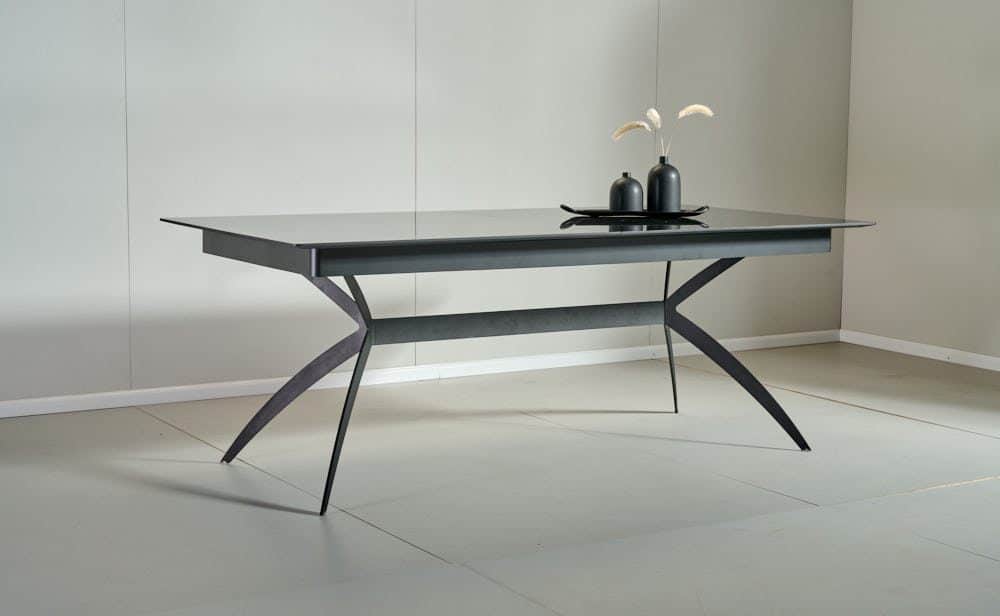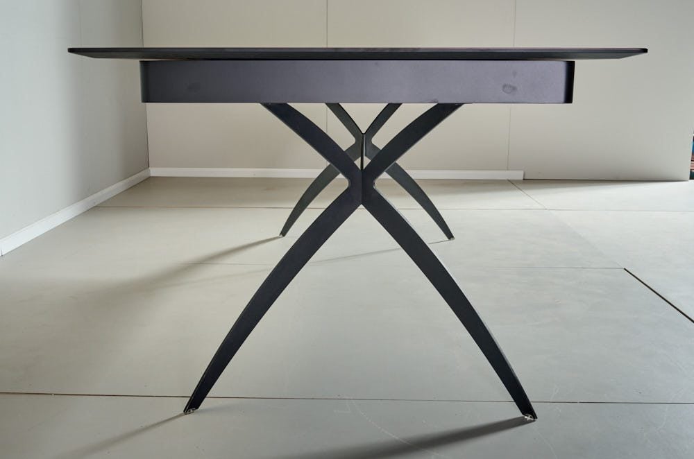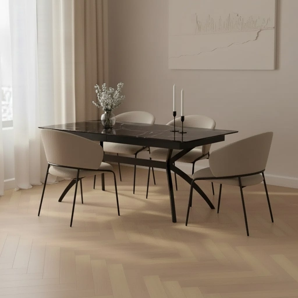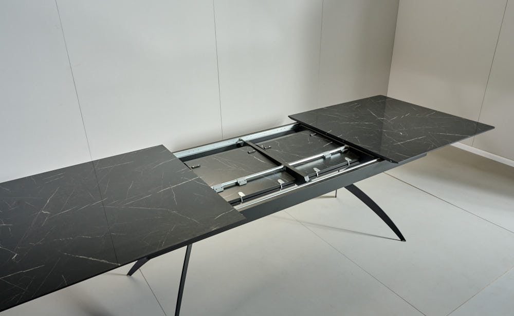 שולחן האוכל עשוי MDF בציפוי למינציה דמוי שיש שחור מבריק , ורגלי השולחן עשויים ממתכת עם גימור צביעה אלקטרוסטטי נגד חלודה בצבע שחור.