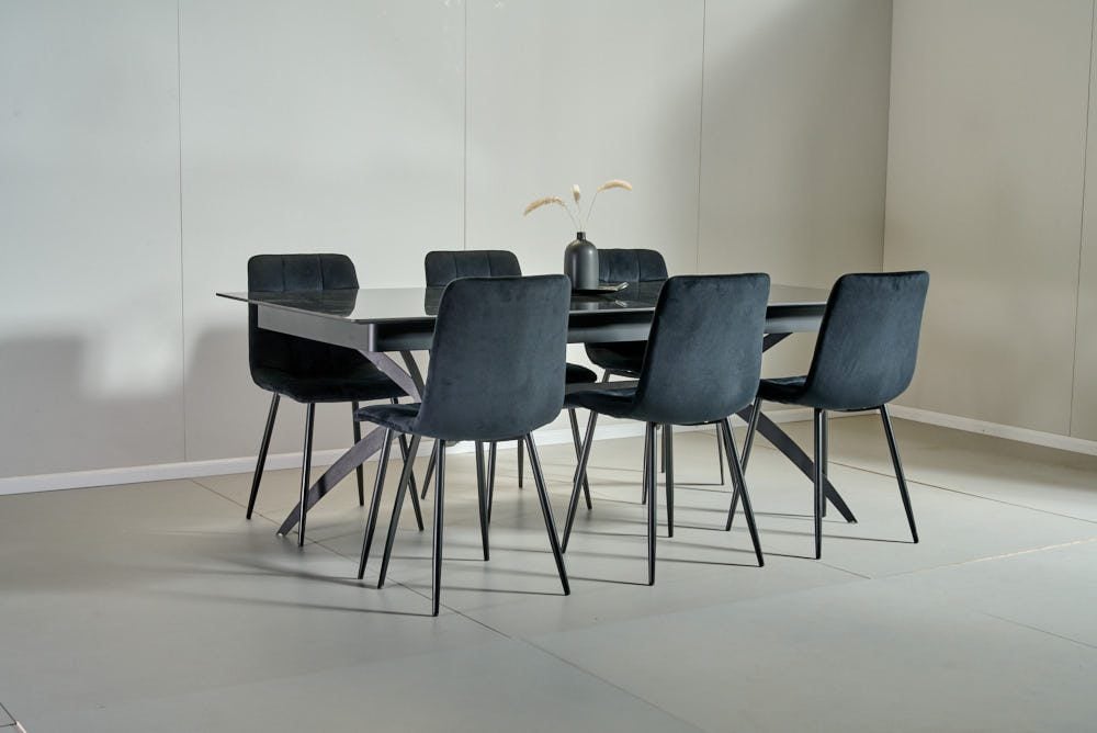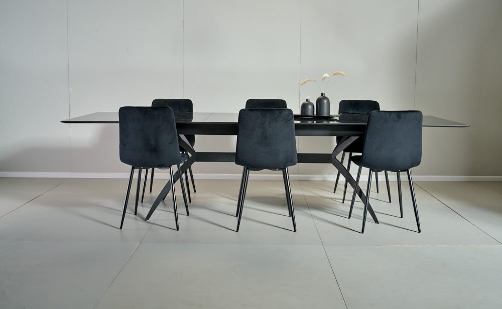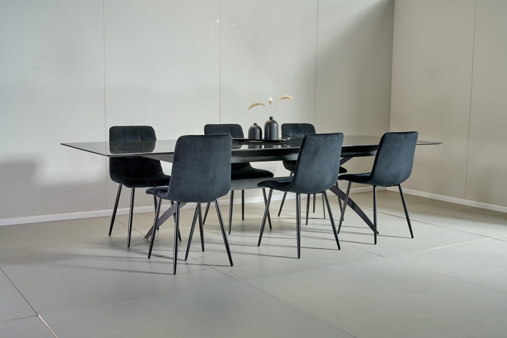 פינת אוכל מלבנית דמוי שיש שחור מבריק דגם קונקורד + 6 כסאות – 14 סועדים