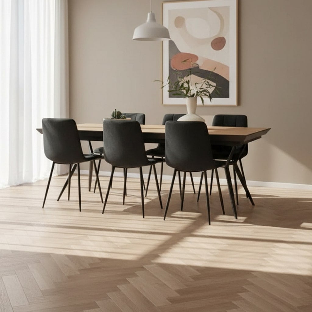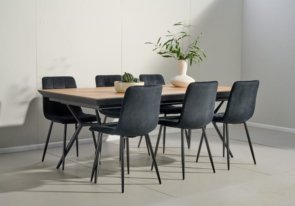 שולחן האוכל עשוי MDF בציפוי למינציה דמוי עץ טבעי, ורגלי השולחן עשויים ממתכת עם גימור צביעה אלקטרוסטטי נגד חלודה בצבע שחור.