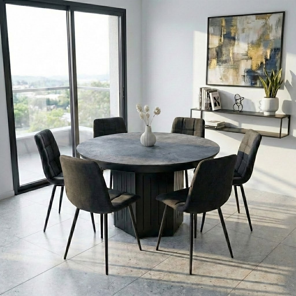 פינת אוכל עגולה נפתחת דגם טרוסה דמוי בטון + 6 כסאות – 16 סועדים