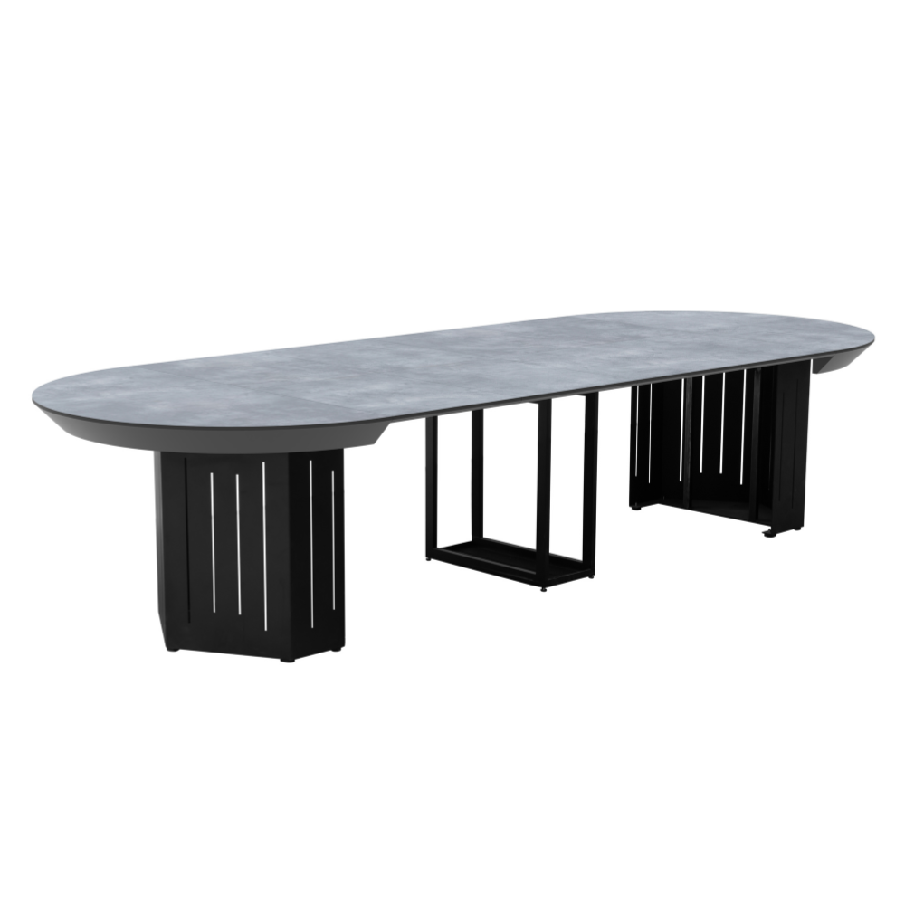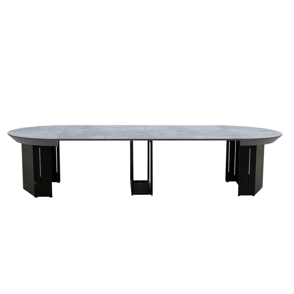 מרכז השולחן כולל רגל מתכת בצבע שחור בעיצוב מודרני, המעניקה יציבות מקסימלית לצד מרווח ישיבה נוח במיוחד. המבנה הייחודי מאפשר להכניס את הכיסאות בצורה מלאה מתחת לשולחן וליהנות מניצול מושלם של החלל. בנוסף, בתחתית הרגליים קיימים פלסטיקים למניעת שחיקה, השומרים על הרצפה ומעניקים יציבות נוספת.