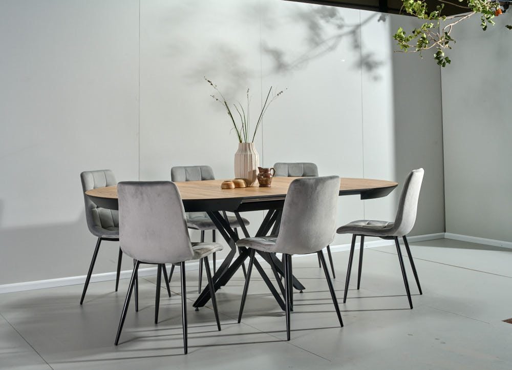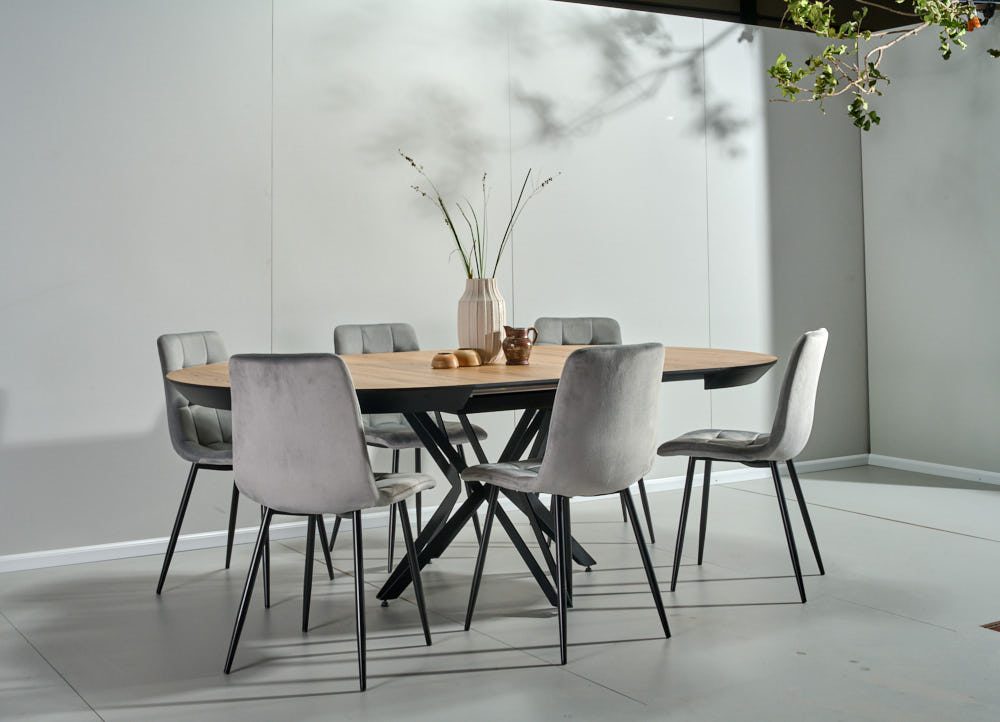 שולחן האוכל עשוי MDF בציפוי למינציה דמוי עץ טבעי, ורגלי השולחן עשויים ממתכת עם גימור צביעה אלקטרוסטטי נגד חלודה בצבע שחור.