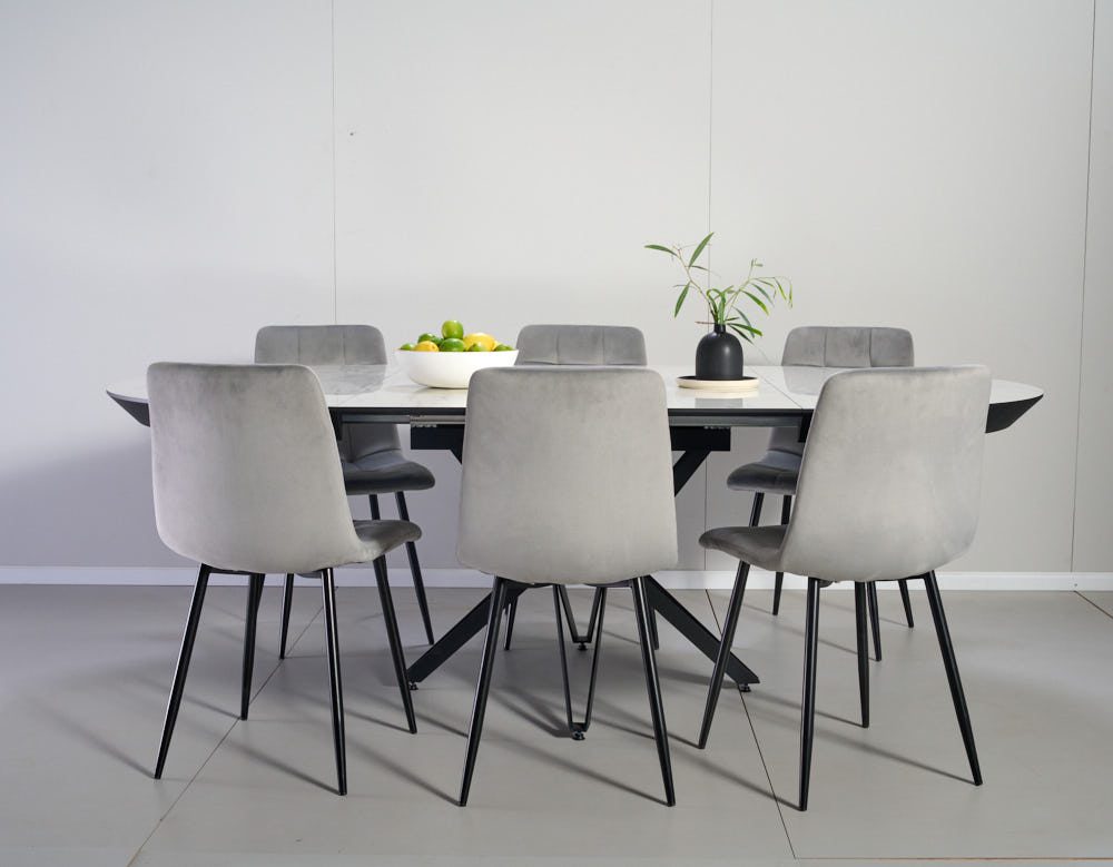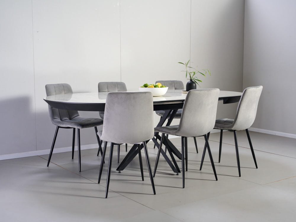 שולחן האוכל עשוי MDF בציפוי למינציה דמוי שיש לבן מבריק, ורגלי השולחן עשויים ממתכת עם גימור צביעה אלקטרוסטטי נגד חלודה בצבע שחור.