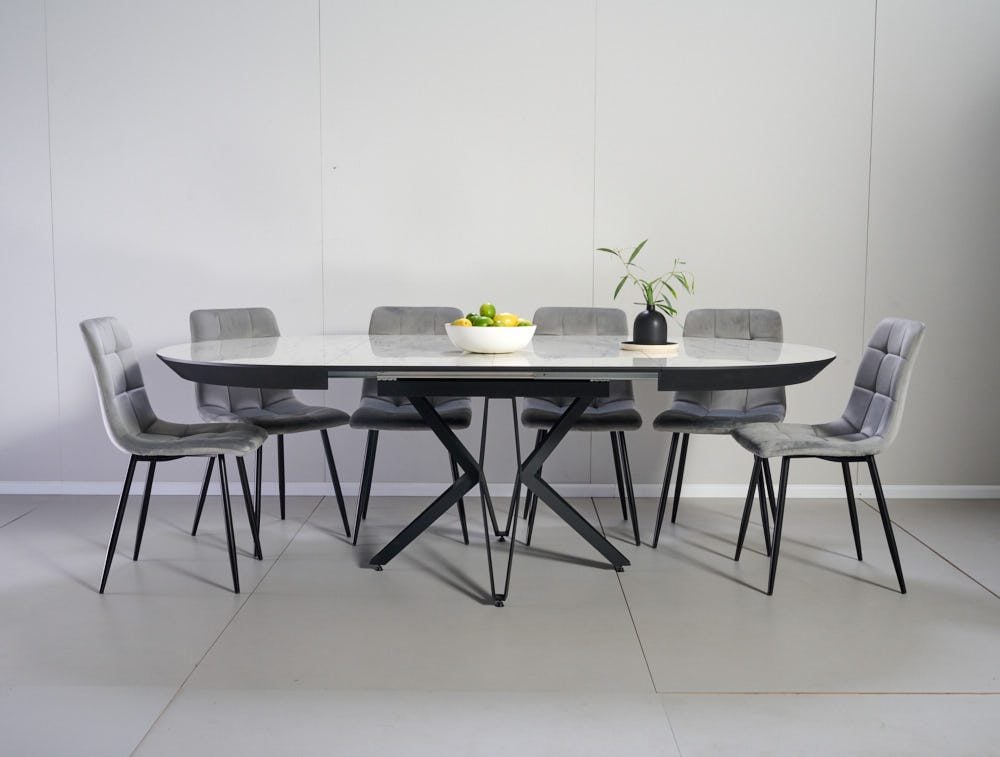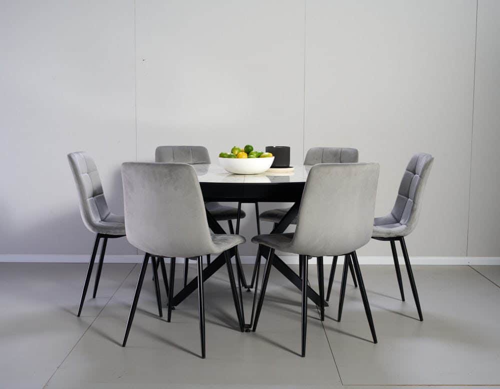 פינת אוכל עגולה נפתחת דמוי שיש לבן מבריק דגם רפאלו + 6 כסאות – 10 סועדים