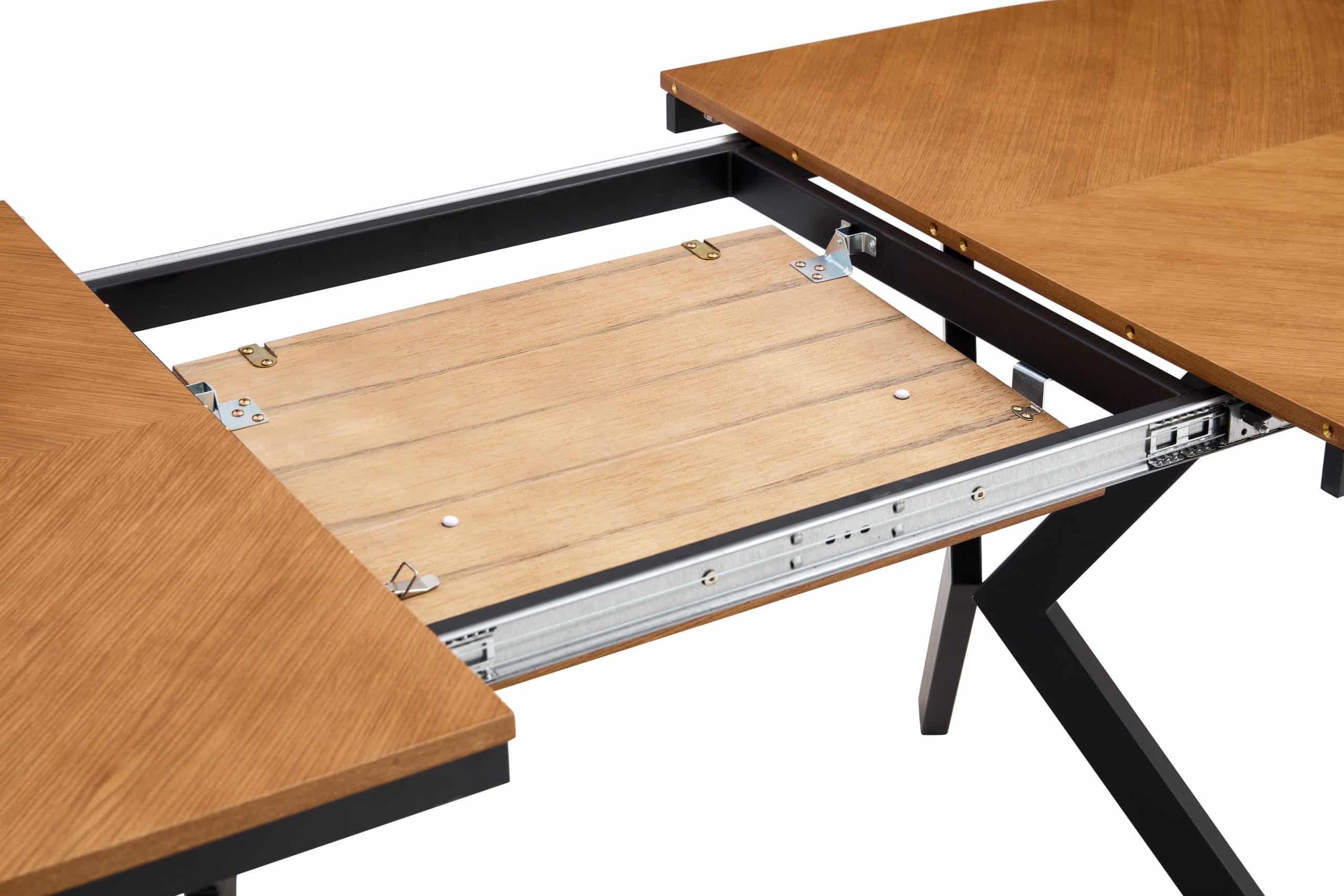 פינת האוכל עשויה MDF בציפוי פורניר אלון טבעי, ורגלי השולחן עשויות מתכת עם שכבת פלסטיק המגינה על הרגליות למניעת שחיקה.